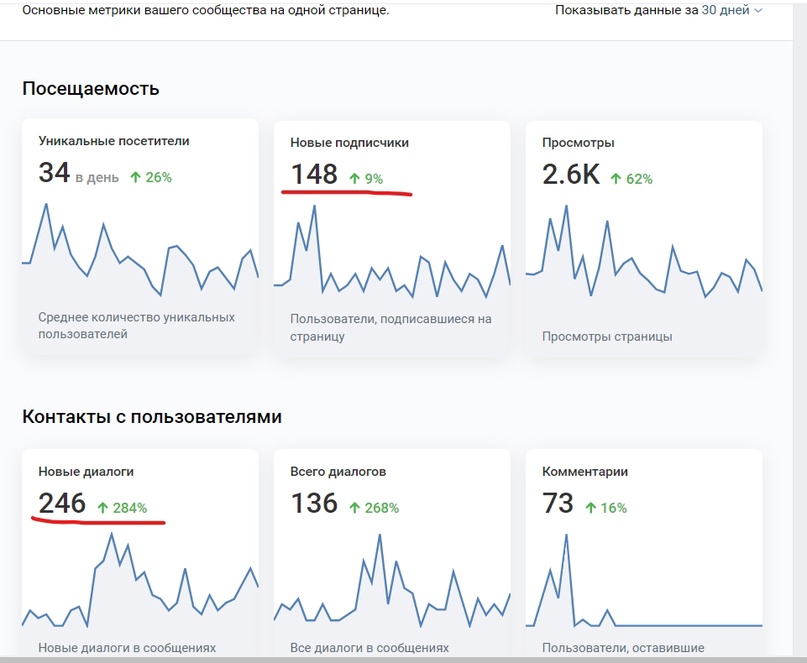 Статистика за 30 дней рекламы с трафиком на подписную страницу. Обратите внимание на кол-во новых диалогов в группе.